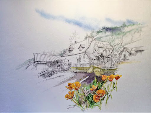 Après la belle pierre grise ou brune de l'Aveyron, voici les murs clairs et les toits de tuile d'un climat plus méditerranéen. Je visite beaucoup de villages et de sites, car je vais retrouver samedi 27 août, 11 aquarellistes adultes qui viennent me rejoindre à Saint-Bauzille-de-Putois pour 6 jours de peinture sur le motif.